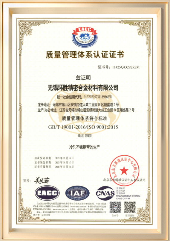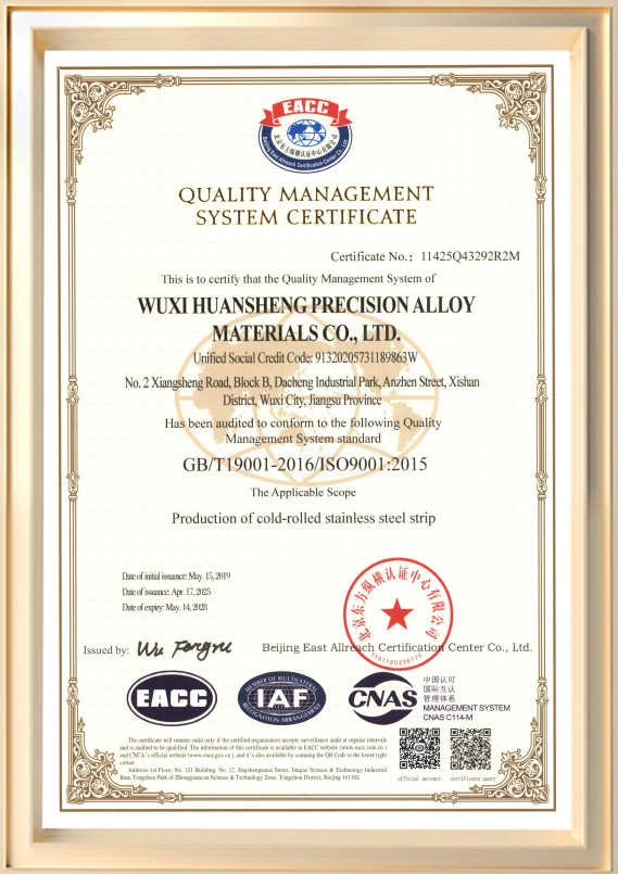 Được thành lập vào năm 2001, Công ty TNHH Vật liệu hợp kim chính xác Vô Tích Huansheng (trước đây là Công ty TNHH Sản phẩm kim loại Vô Tích Huansheng) là nhà sản xuất chuyên ngành tham gia vào hoạt động R&D và sản xuất các dải thép không gỉ cán nguội. Công ty có vốn đăng ký 60 triệu RMB và diện tích nhà máy khoảng 45.990 mét vuông, công suất sản xuất hàng năm lên tới 72.000 tấn. Độ dày sản phẩm dao động từ 0,03 mm đến 3,0 mm, với chiều rộng tối đa 550 mm.
