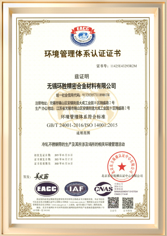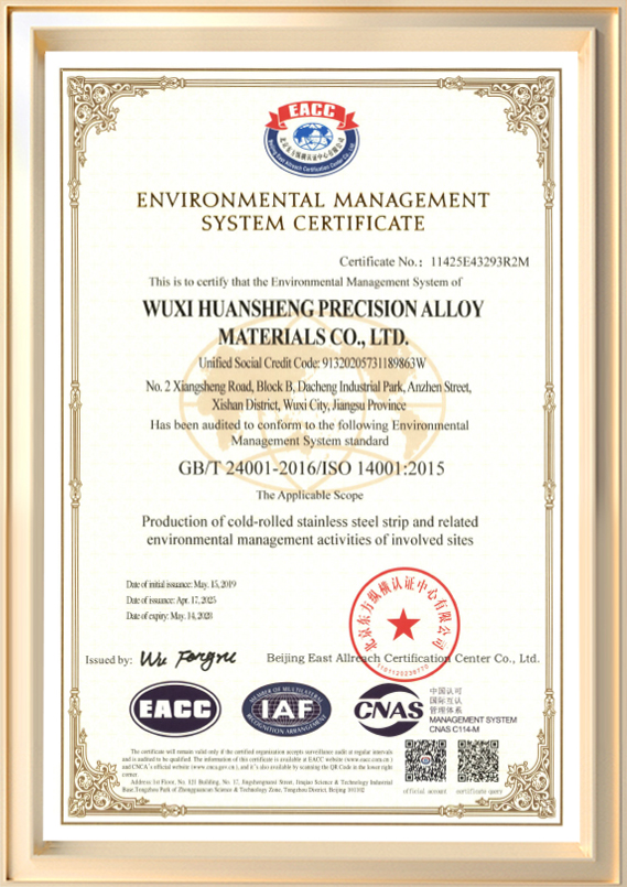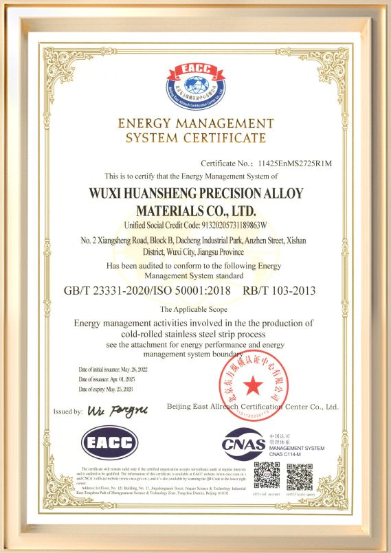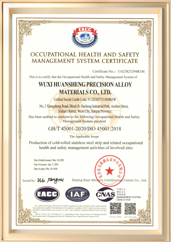 Được thành lập vào năm 2001, Công ty TNHH Vật liệu hợp kim chính xác Vô Tích Huansheng (trước đây là Công ty TNHH Sản phẩm kim loại Vô Tích Huansheng) là nhà sản xuất chuyên ngành tham gia vào hoạt động R&D và sản xuất các dải thép không gỉ cán nguội. Công ty có vốn đăng ký 60 triệu RMB và diện tích nhà máy khoảng 45.990 mét vuông, công suất sản xuất hàng năm lên tới 72.000 tấn. độ dày sản phẩm của chúng tôi dao động từ 0,03 mm đến 3,0 mm, với chiều rộng tối đa là 650 mm. Được hỗ trợ bởi đội ngũ kỹ thuật giỏi và hệ thống quản lý hiện đại, công ty đã đạt được nhiều chứng chỉ quốc tế, bao gồm ISO 9001, ISO/TS 16949 và ISO 14001.